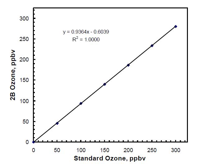 在本例中,校準(zhǔn)參數(shù) S 為 1/0.9364 = 1.068,四舍五入為 1.07。該圖的 y 截距,即方程 y = mx + b 中的 b,在上例中為 -0.6,應(yīng)在臭氧校準(zhǔn)源設(shè)置為零時(shí)測(cè)量的偏移的 ±2 ppb 范圍內(nèi)。如果不是,則儀器可能存在問題。通常,這表明臭氧監(jiān)測(cè)器流路中存在污染。