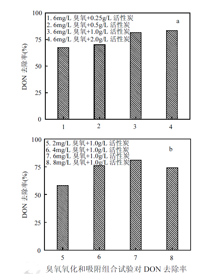 3.在臭氧氧化和活性炭吸附組合試驗中,DON 的去除率 很大可達 83.3%;臭氧投加量固定(6.0mg/L),隨活性炭投加量增加(從0.25g/L增加到2.0g/L),協(xié)同因子從1.15到1.09,表明此時臭氧/活性炭體系中存在著明顯的協(xié)同效應;當活性炭投加量固定(1.0g/L),臭氧投加量為2,4,6mg/L,協(xié)同因子分別為1.12、1.07 和1.10,臭氧/活性炭體系中也存在著一定程度的協(xié)同效應,臭氧投加量為8mg/L時,協(xié)同因子為0.97,系統(tǒng)無明顯協(xié)同作用.