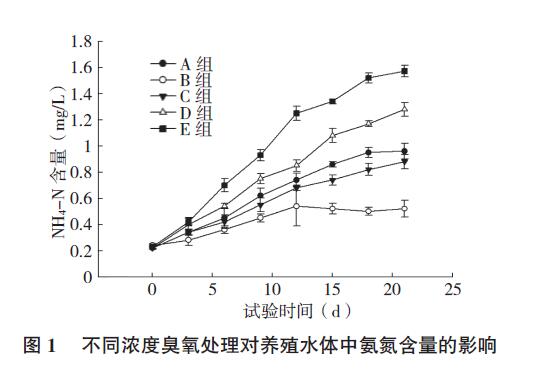 由圖1、圖2 可知,各組水體氨氮和亞硝酸鹽含量都呈上升趨勢。與對照組(E 組)相比,經過臭氧處理水體中的氨氮和亞硝酸鹽含量上升緩慢,可見臭氧對水體中的氨氮和亞硝酸有明顯的降解效果。B 組(0.1 mg/L 臭氧)水體的氨氮和亞硝酸鹽含量顯著低于其他幾組,而A 組(0.05 mg/L 臭氧)水體的氨氮含量和亞硝酸鹽含量雖然與C 組(0.15 mg/L 臭氧)相比差異不顯著,但高于C 組。可見,較低濃度臭氧對水體中氨氮和亞硝酸鹽降解效果不顯著,但其濃度也不是越高越好。