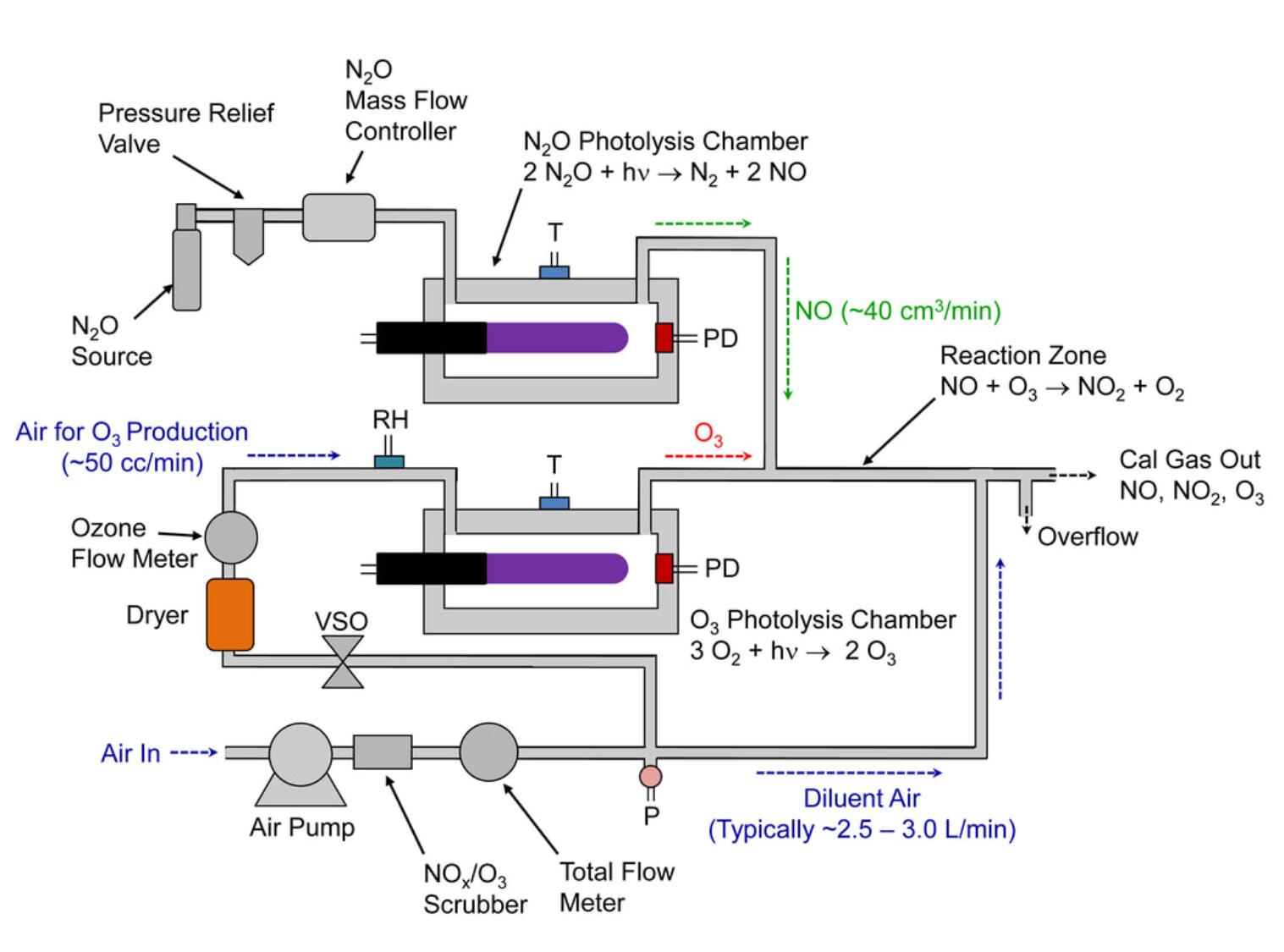 美國(guó)2B 714 型 NO 2 /NO/O 3 Calibration Source ™結(jié)合了 2B Technologies 的 306 型臭氧校準(zhǔn)源™ 和 408 型一氧化氮校準(zhǔn)源™ 以產(chǎn)生 O 3、NO 和 NO 2的校準(zhǔn)源。714 型使用兩個(gè)低壓汞燈,一個(gè)用于光解氧氣以產(chǎn)生 O 3,另一個(gè)燈用于光解一氧化二氮 (N2 O ) 以產(chǎn)生 NO。在 O 3與過(guò)量的 NO 將 NO 轉(zhuǎn)化為 NO 2的化學(xué)計(jì)量反應(yīng)中產(chǎn)生二氧化氮。714 型的示意圖如下所示: