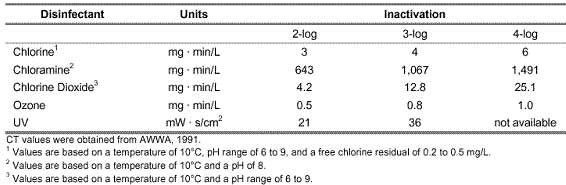 原生動(dòng)物隱孢子蟲(chóng)很難被氯和氯胺滅活。對(duì)于1-log失活(= 90%失活),氯失活的Ct值在3000和4000mg min / L之間變化。兩個(gè)表都來(lái)自環(huán)境保護(hù)局(EPA)。